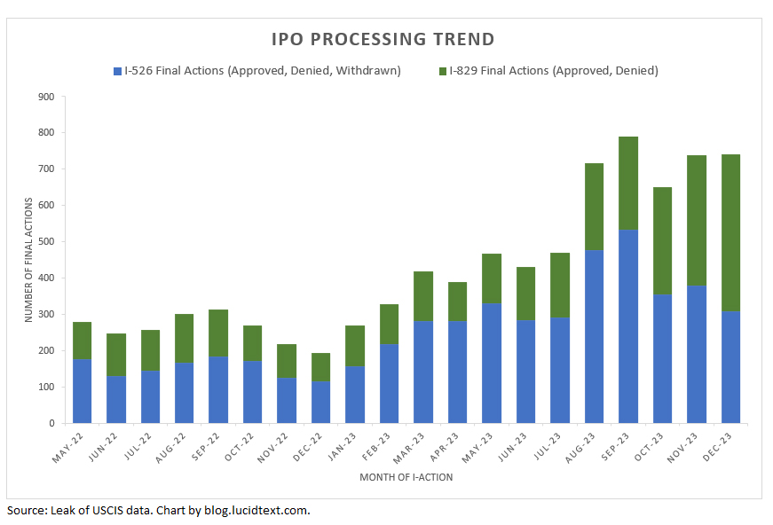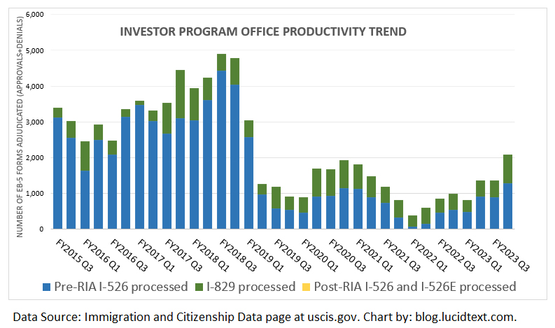 Answer from Q4 data: USCIS has not abandoned pre-RIA petitions, and obviously made extra effort to improve I-526 and I-829 volumes for the fiscal year-end. There’s been a fairly consistent improvement trend since the rock bottom of 2021, which is great to see. But in a wider context, the best efforts of FY2023 Q4 are still only barely as good as mid-Pandemic processing volume, and still three times lower than the I-526 volumes USCIS was achieving prior to 2019. FY2023 ended with just under 10,000 I-526 and 10,000 I-829 pending. You do the math for how long it would take to clear that inventory if USCIS continues to adjudicate at a rate of 1,300 I-526 and 800 I-829 per quarter. The Investor Program Office must continue to ramp up its efforts (not slack off, as we’ve seen so far in the months since September).