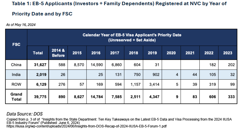 Table 1 above has a stark message for India: 1,834 applicants with 2019 and earlier priority dates were still waiting at NVC for Unreserved EB-5 visas as of May 2024 – and that’s only at NVC, not counting 1,000+ Indians waiting for I-485 status adjustment as of April 2024, or potential applicants waiting for I-526 approval and NVC transfer. (Note: there is potentially significant overlap between the I-485 list and both the NVC list and the pending I-526 list.)
