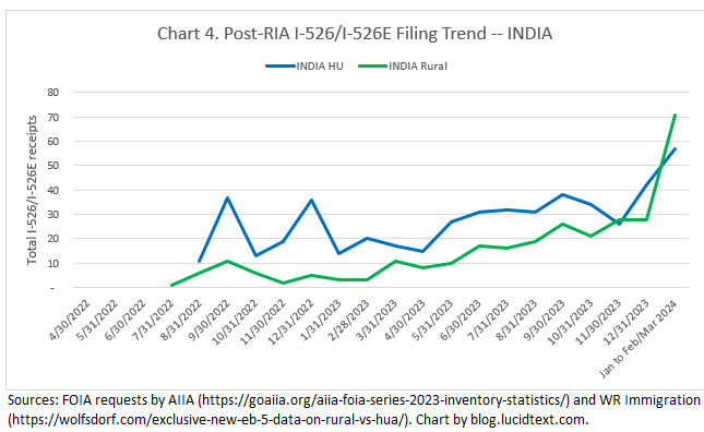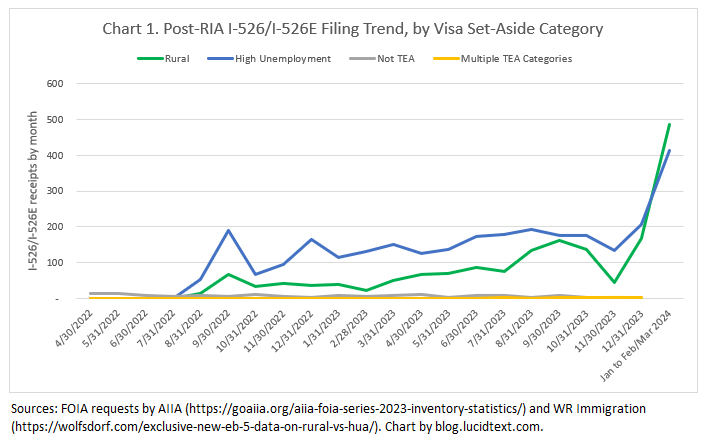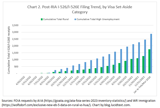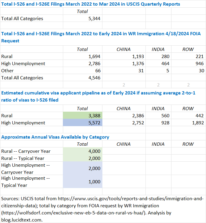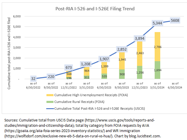 I’m happy to report another important addition to the treasury of I-526/I-526E receipt data, with detail on visa category and petitioner county as needed for visa pipeline analysis. This dataset is courtesy of the efficient Joey Barnett of WR Immigration, who managed to extract a record-quick Freedom of Information Act response from USCIS, and immediately and generously made the full record available to the public. The data is published in a blog post here: “Exclusive New EB-5 Filing Data on Rural v. High Unemployment Area Demand as of April 2024!” You’re invited to join Joey Barnett and Charlie Oppenheim in discussing the data during the next edition of The Bulletin – Chatting with Charlie: EB-5 Investor Outlook on September 26, 2024.