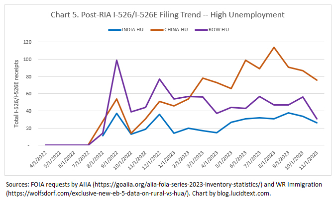I would not commit to a year prediction, but agree that the current pipeline High Unemployment inventory for India and China is alarming from a visa perspective. 5,500+ applicants is obviously a lot for visas that can only be issued about 2,000 in the first year and 1,000/year thereafter, even if visa issuance were simply FIFO with no country cap limits. Wait times would become unthinkable if China and/or India found themselves actually limited to only 7% of 1K (or initially 2K) annual HU visas. Such limitation is possible, if the documented Rest of World HU pipeline to date actually claims HU visas, and ROW demand continues robust. The margins are just so small working with 10% of EB-5 visas, as compared with Unreserved working with 100% (previously) and now around 68% of EB-5 visas. And the situation is volatile as well, since we can’t predict what will happen with denial rates or category-switching (which could reduce the backlogs), or legislative change (which could help or hurt).