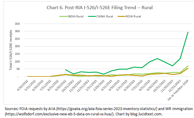 I’ll let charts tell the story of what happened during the recorded part of the March 2024 filing surge, including how Rural demand surged ahead for the first time (particularly thanks to China), while High Unemployment demand dipped but remained sufficiently strong to continue to dominate the cumulative inventory. (The charts combine AIIA’s FOIA data for 2022-2023 with WR Immigration’s FOIA for 2024.)
