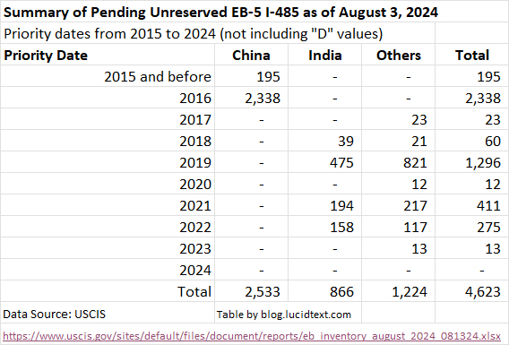 Pending Applications for Employment-Based Preference Categories as of August 3, 2024 (XLSX, 109.41 KB) is wonderfully timely, providing comprehensive I-485 inventory data just a few weeks old. The report now lists pending EB-5 I-485 inventory itemized according to visa category (Unreserved, High Unemployment, Rural, Infrastructure), petitioner priority date (month year), and petitioner country of chargeability (China, India, Mexico, Philippines, or Rest of World). I-485 can now be filed concurrently with I-526/I-526E, so this report is effectively another view into I-526/I-526E receipts by country and TEA category. It’s limited to the portion of investors who are in the USA pursuing status adjustment, not including demand from abroad, but has the advantage of being very recent, and updated monthly.