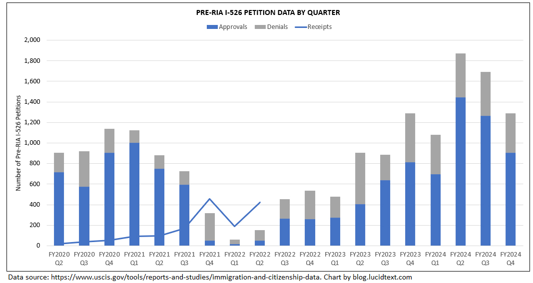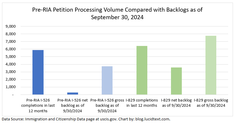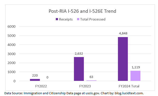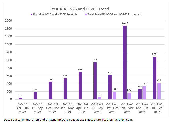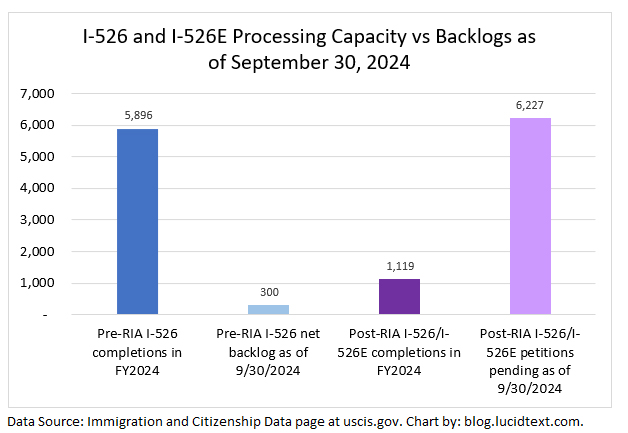 The chart shows that USCIS just had its best EB-5 processing year since 2018. EB-5 form completions more than doubled from the previous year, and reduced the I-526 and I-829 backlog to the lowest level since before 2015. USCIS also managed to process 1,119 post-RIA I-526 and I-526E, thus generating a significant number of applicants for set-aside visas in 2025. If the processing capacity applied to pre-RIA I-526 in 2024 is moved to I-526E in 2025 (as it might be, considering that the net backlog for I-526 is only 300 forms), then nearly all currently-pending I-526E could be processed in 2025. This is the good news.