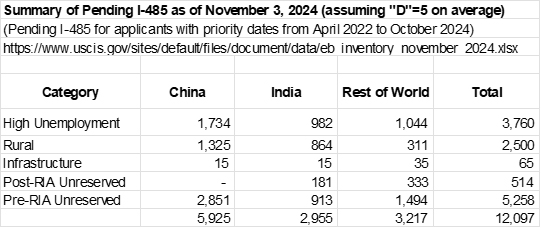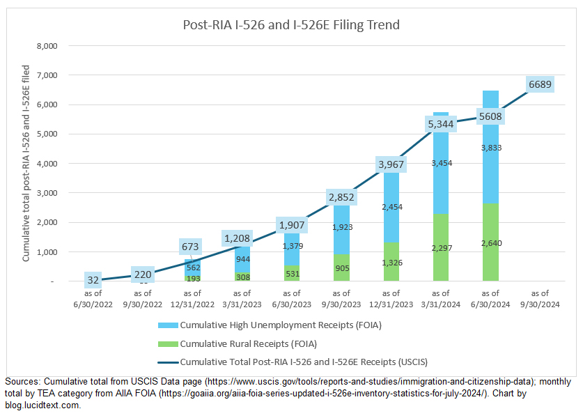 Meanwhile, I-526E receipts in FY2024 reflect EB-5 demand at its highest level since before 2019, and once again shooting above the level possible to accommodate under the EB-5 numerical limit (i.e. about 10,000 visas annually, of which historically an average 38% go to investors while the rest to go spouses and children). Incoming EB-5 demand is largely aimed at the fraction of visas in set-aside categories, and lacks an escape route since Department of State is still working through the legacy Unreserved visa backlog generated by excess EB-5 demand from 2012 to 2019, as illustrated in the above chart. When the Unreserved backlog disappears (which I calculate could happen by 2030), thus clearing the way for post-RIA applicants to access Unreserved as well as Set-Aside visas, the 10,000 annual visa limit would still not be sufficient to accommodate new investors coming in at a rate of nearly 5,000 per year, as happened in FY2024.