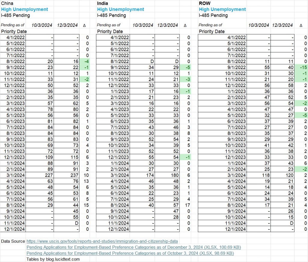 And now, on to more detailed tables that compare the December 3, 2024 report with the October 3, 2024 report. Looking at inventory changes, I can make some inferences about what happened with EB-5 processing in the first two months of FY2025.