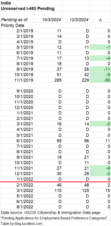 Great article Suzanne. One slight correction, i am getting a total number of I-485 India Unreserved (Pre-RIA) pending as of Dec 3 2024 as 712 instead of 882 as mentioned on top of this post