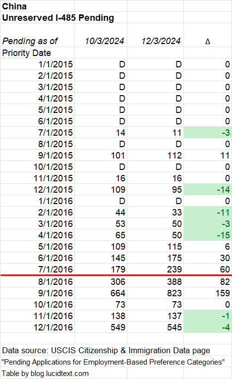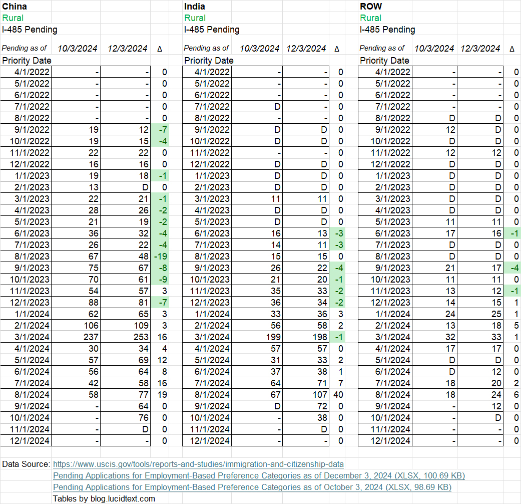 And now, on to more detailed tables that compare the December 3, 2024 report with the October 3, 2024 report. Looking at inventory changes, I can make some inferences about what happened with EB-5 processing in the first two months of FY2025.