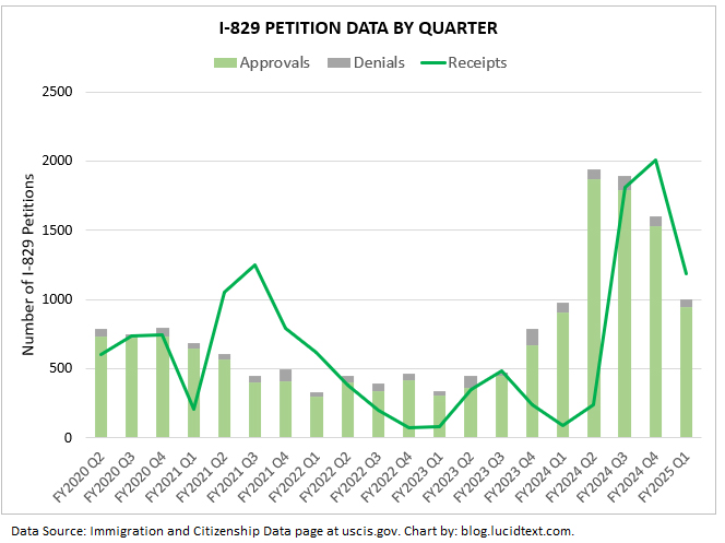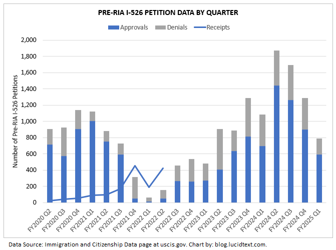 Be cautious in interpreting the Processing Time number, which is not necessarily predictive! Footnote 6 to the Processing Times column explains: “Processing times are defined as the number of months it took for an application, petition, or request to be processed from receipt to completion in a given time period. The number of months presented is the median which is the time it took to complete 50% of all the cases processed in the quarter.” I’m very happy for the 50% of recently-completed I-526E that experienced a processing time of less than 12 months. However, 50% of the 202 completions in FY25 Q1 is just 101 forms — barely 1% of the inventory. How long will it take to process the 6,922 I-526E that remained pending at the end of last quarter? If USCIS kept going at the FY25 Q1 processing pace, then it would take 6,922/202=34 quarters=8.6 years. In order to get through the pre-2025 I-526E inventory in 12 months from now, USCIS would have to increase quarterly I-526E processing volume to 6,922/4=1,730 completions. On the other hand, the reported median processing time of 19.2 months for I-829 may be reasonably predictive, so long as USCIS can keep processing the I-829 inventory (7,553 at last count) at a rate of at least 1,000 completions per quarter.