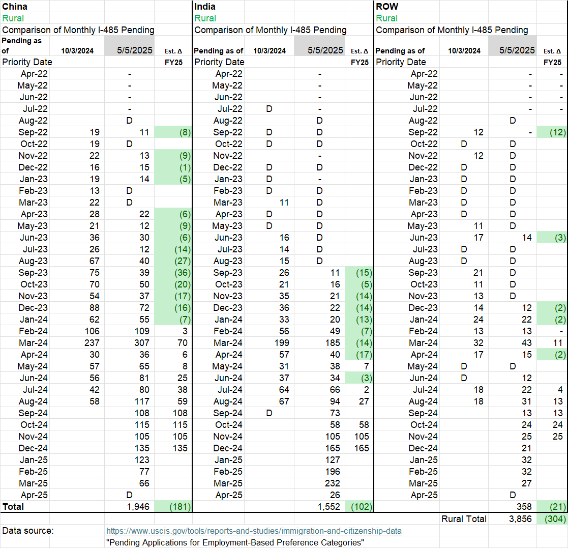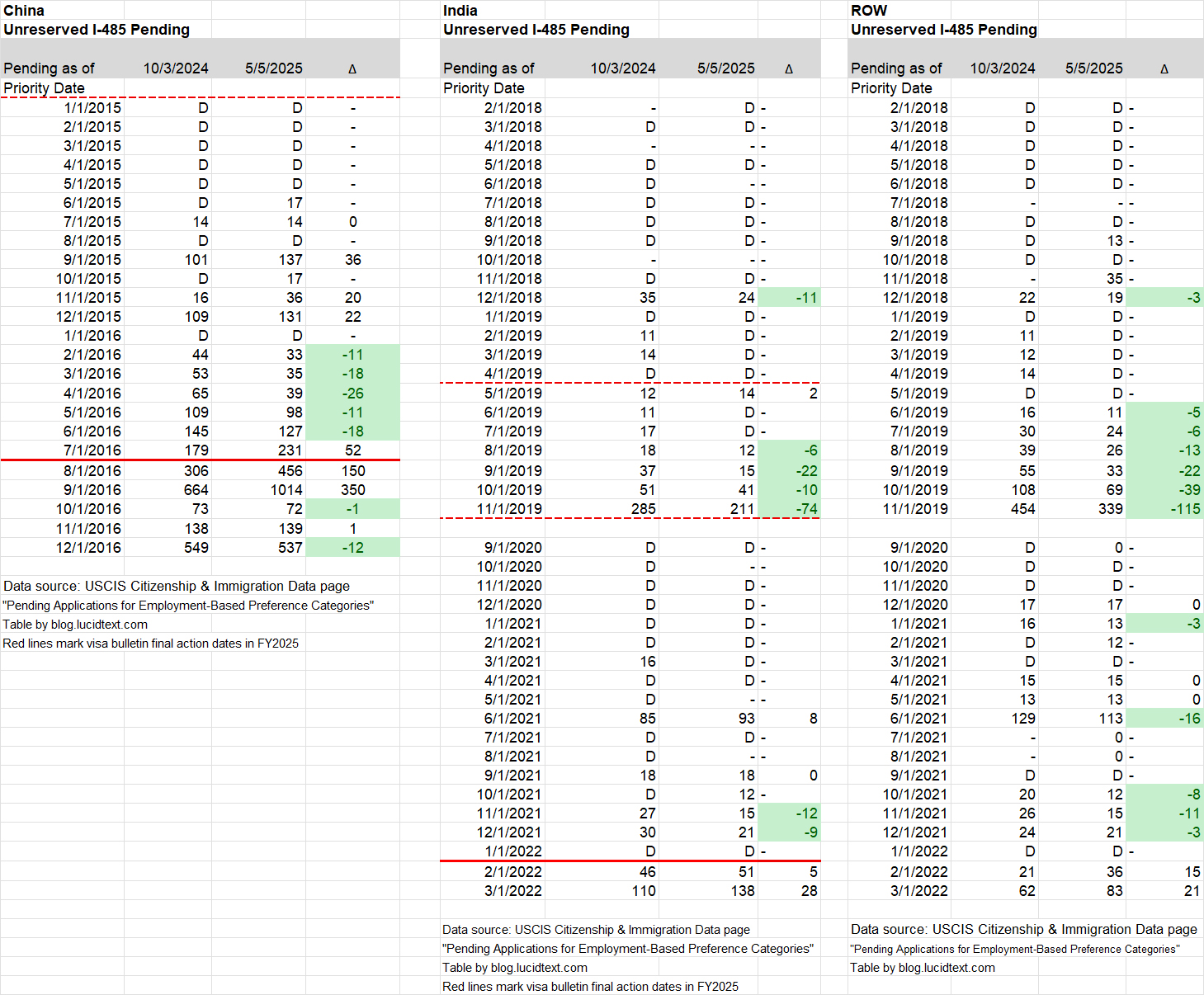 Monthly DOS and I-485 reports haven’t been published yet since May, but here FYI are my summaries of the May 5 pending I-485 inventory report, compared with the corresponding report from the start of FY2025.