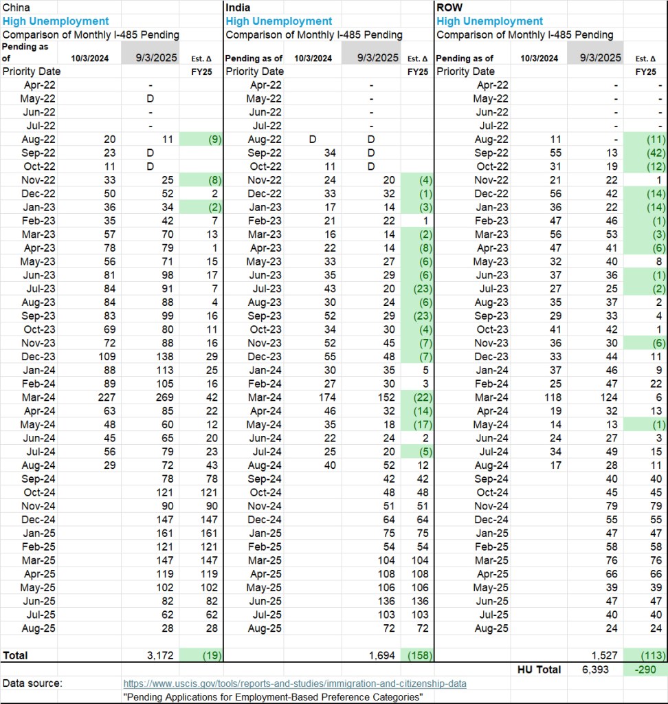 That is an interesting suggestion and sounds plausible. Also, my change comparison of two widely-spaced inventory months can only support very rough estimates about volume, not precisely reflect I-485 approvals. Inventory changes result from additions to as well as subtractions from the inventory, and I don’t know which most drives the difference in patterns (or how many differences are elided in the intermediate months that I didn’t compare).