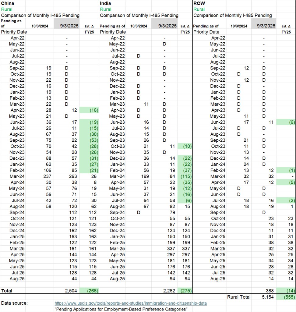 Comparing the I-485 pending inventory as of September 2025 with the inventory as of October 2024 gives a hint at the volume and distribution of status adjustment visas issued in FY2025. Only a rough hint, since new receipts and denials also contribute to inventory change, the comparison misses change in intermediate months, and numbers <11 are redacted. But inventory report comparisons at least give some window into visa processing.