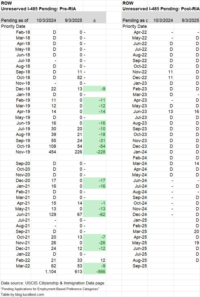 For Unreserved, I’m particularly interested to notice a significant number of post-RIA Unreserved applicants. I doubt that many people have invested at the $1.05 million level, so assume that many/most of these post-2022 Unreserved applicants represent Rural or High Unemployment investors who chose to request Unreserved visas. I also note the number of India Unreserved I-485 pending as of September 2025. One would think, looking at the Visa Bulletin alone, that the India Unreserved backlog is on track to clear out this year. That seems less likely when one considers over 600 India Unreserved I-485 still pending as of September 2025, not to mention however many India-born applicants are still registered with NVC for consular processing.