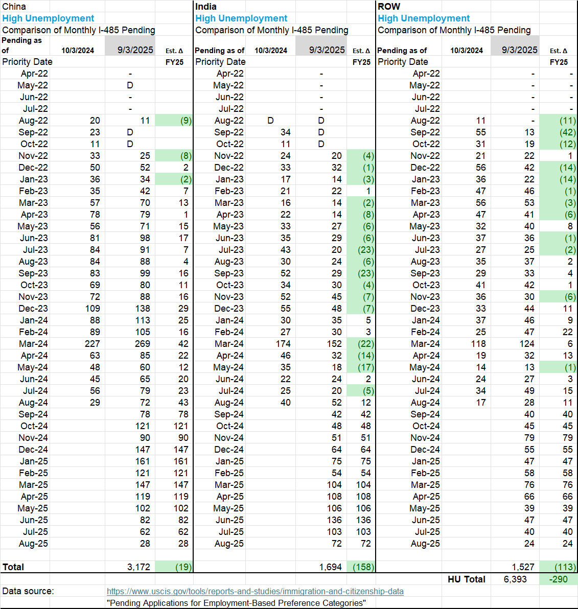 That is an interesting suggestion and sounds plausible. Also, my change comparison of two widely-spaced inventory months can only support very rough estimates about volume, not precisely reflect I-485 approvals. Inventory changes result from additions to as well as subtractions from the inventory, and I don’t know which most drives the difference in patterns (or how many differences are elided in the intermediate months that I didn’t compare).
