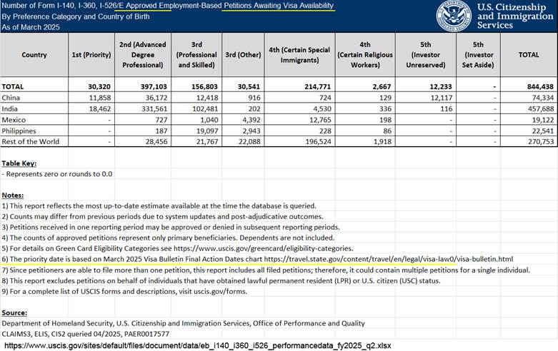 Compare to the March 2025 USCIS report, which referenced the March 2025 Visa Bulletin to define the cutoff for visa availability.
