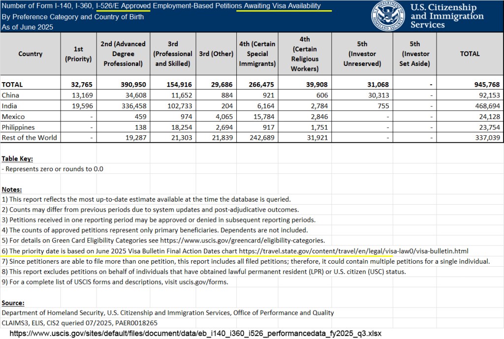 I added yellow underlining to the screenshot to highlight key interpretive clues. The data refers to “approved” I-526/E petitions only (not to all filed or pending petitions). It does not cover all approved petitions, but only the subset of approved petitions that are defined as “awaiting visa availability.” And “awaiting visa availability” is defined with reference to a given monthly visa bulletin Final Action Dates chart.