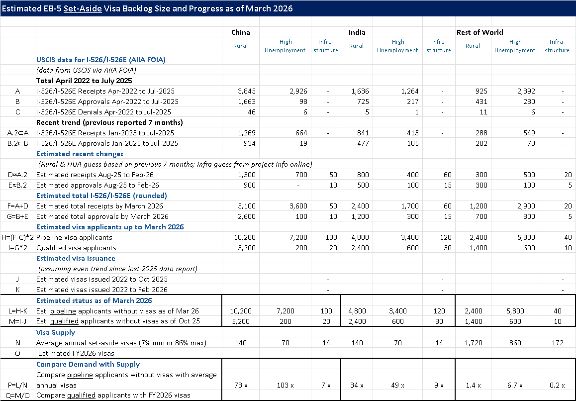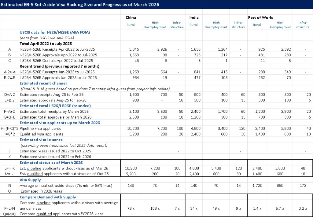 I made myself some big spreadsheets to work with the sorting question, experimenting with how the pipelines of Pre-RIA, Rural, High Unemployment and Infrastructure investors from China, India, and Rest of World might get optimally matched into available EB-5 visa pools (and react to a variety of scenarios on factors like family sizes and denial rates and ongoing demand). I can make my spreadsheet conclude that Chinese and Indian investors with priority dates through 2026 could all have been matched with visas by 2033 or so, regardless of the TEA category in which they invested. I’m not putting the spreadsheet on the Internet because it’s a low-confidence conclusion, with many assumptions and elaborate setup that take a lot of explanation and qualification. The reality could be shorter or much longer, particularly for individual cases.