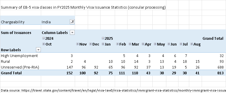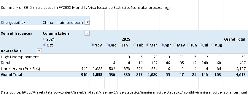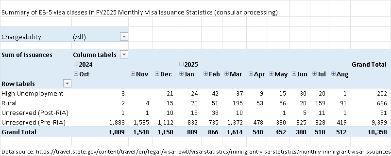I shall claim credit! Hours after I finally gave up on government updates and published my important 2026 backlog post without new data, Department of State updated the Monthly Visa Issuance Statistics page for the first time in nine months. Now we know for sure how many EB-5 visas were issued through consulates in June, July, and August 2025. The numbers are about what I’d guessed — a bit higher for Rural and lower for High Unemployment, and higher for India and lower for China than I’d expected. But it’s really great to see solid numbers again, thank you DOS! Now we just need the NVC waitlist and FY2026 visa limit. The following pivot tables summarize FY2025 monthly consular visa issuance to date, now including June to August.