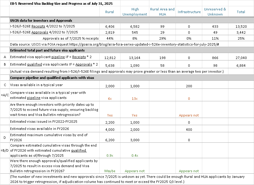 Table 1 summarizes the estimated EB-5 backlog as of January 2025. This includes legacy EB-5 applicants who started the process before RIA passed in March 15, 2022, and now still waiting for Unreserved visas. And the backlog includes nearly all EB-5 applicants with priority dates since March 2022, because Rural and High Unemployment visa issuance is just now finally getting started as of FY2025.