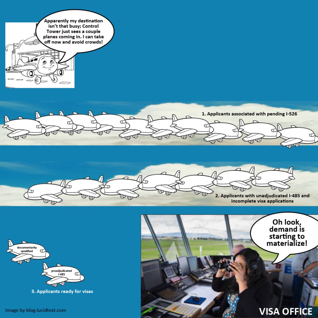 I considered writing an article about the October 2022 Visa Bulletin, discussing what it means for demand to “materialize,” as the visa bulletin notes like to say. Also, pointing out which applicants the visa office accounts for in setting monthly visa bulletin dates, which applicants (by contrast) we need to account for in estimating visa wait times, and what all that means for predicting future action dates. But instead, I made a picture. I hope that just looking at this image can help conceptually. After examining the picture, you may want to consult this presentation and my data summary for most recent available estimates of the number of applicants hidden in the EB-5 process clouds (not yet on the Visa Control radar, but important for us because determinative for future visa bulletins). And then if you still really wish you had an article about the Visa Office perspective behind visa traffic control, I recommend Note F in the November 2021 Visa Bulletin, this article, and the Chat with Charlie for the April 2021 visa bulletin.