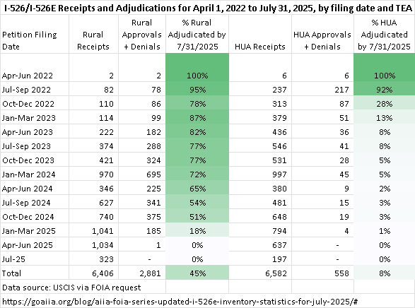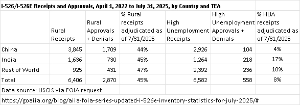 I’m happy to report new USCIS data obtained via Freedom of Information Act by the investor association AIIA (with litigation by Galati Law). See AIIA’s new post AIIA FOIA Series: Updated I-526E Inventory Statistics for July 2025 for the data plus detailed analysis. The FOIA covers I-526/I-526E receipts, approvals, and denials by TEA category, petitioner country, and filing date from April 1, 2022 to July 31, 2025.