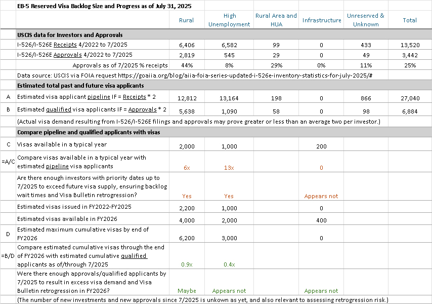 The data cited in the image is old now, since USCIS hasn’t published a data report since March 2025 and DOS hasn’t published a report since May 2025. But unless processing volumes magically improved in the unreported last six months, we may still be stuck with little set-aside visa issuance activity — and thus no visa bulletin activity yet — despite the high number of Rural and High Unemployment investors. (By the way, you can find my data collection saved together with source links on the EB5 Timing Page.)